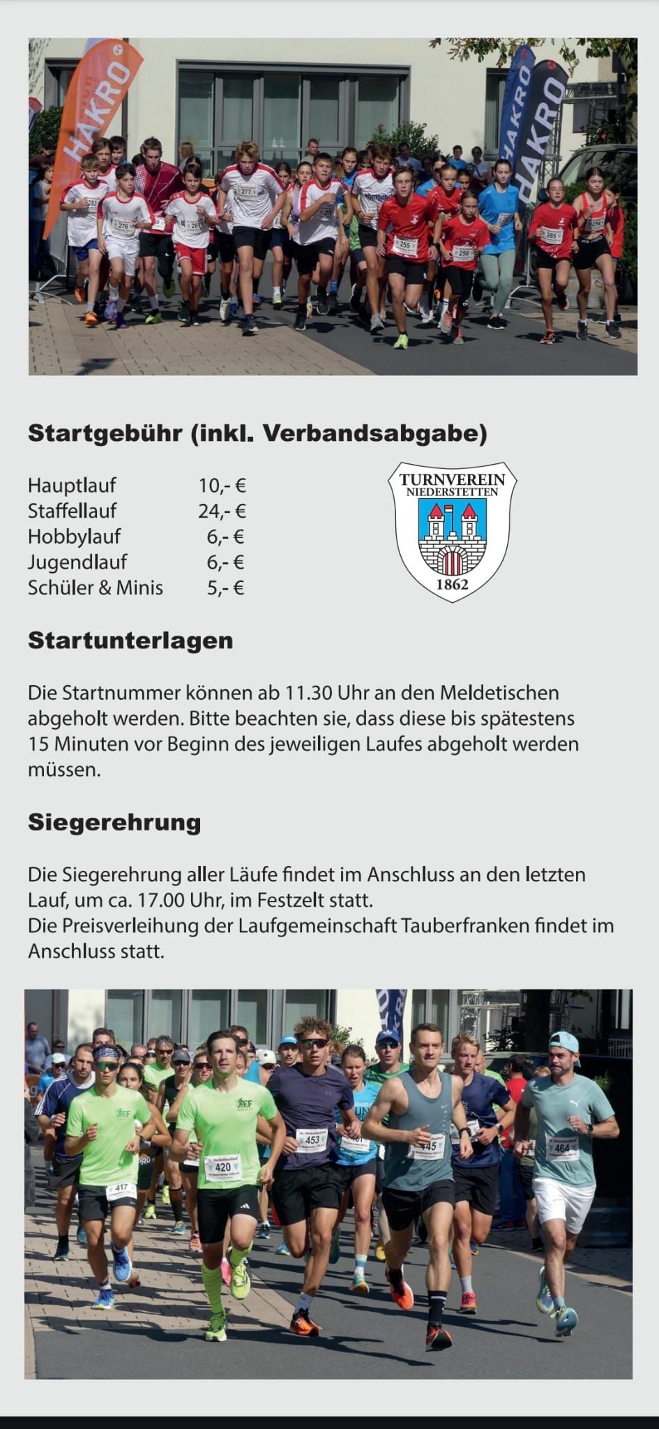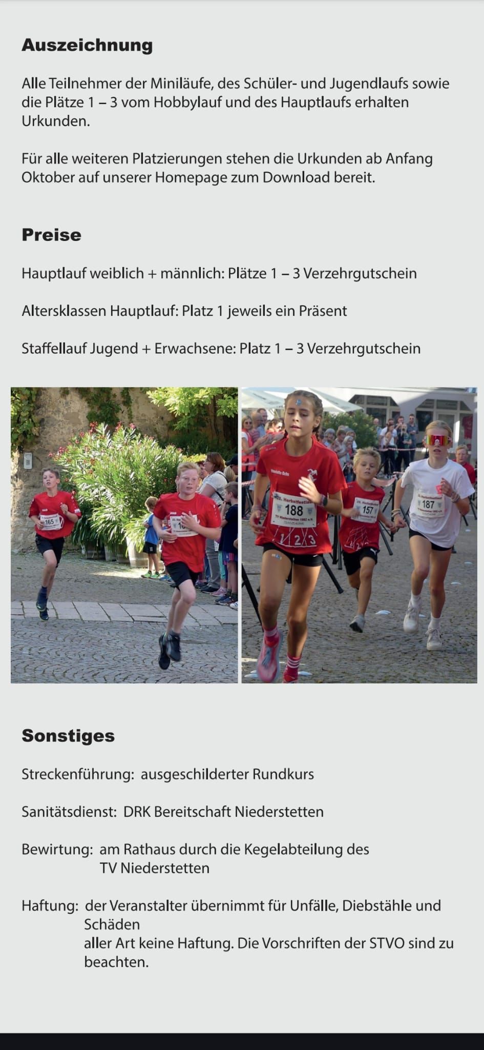 Als Höhepunkt im Veranstaltungsjahr veranstaltet der TV Niederstetten zum Herbstfest den Herbstfestlauf, welcher immer am Herbstfestsamstag stattfindet. Die Siegerehrung findet nach Abschluss des Laufs im Festzelt statt, wo sich die Athleten nach den überstandenen Anstrengungen auch entsprechend stärken und den Tag in gemütlicher Atomsphäre ausklingen lassen können.