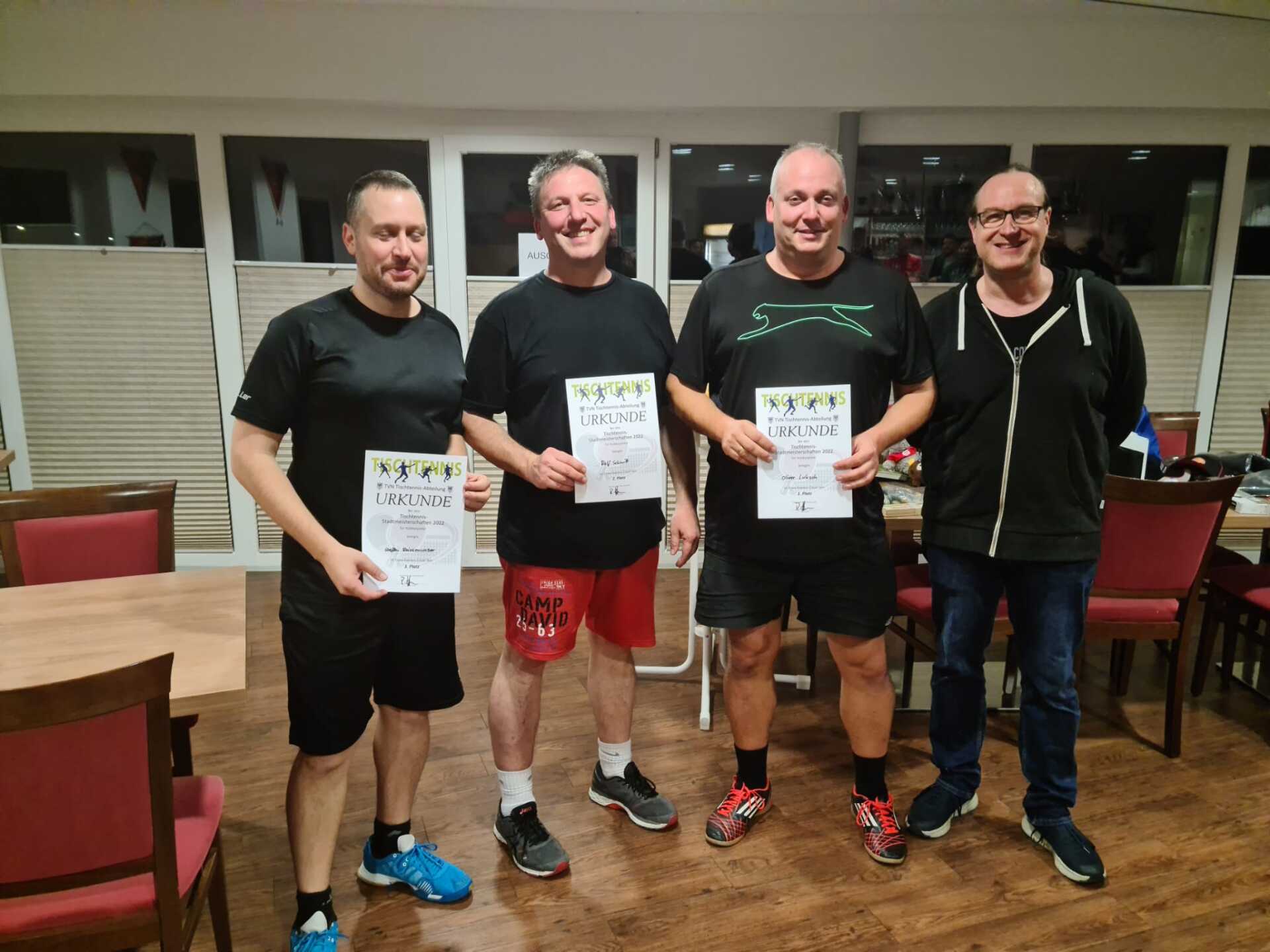 Im Doppelwettbewerb erreichten Dirk Marquard und Markus Käss gegen Andreas Gross und Steffen Reissenweber das Endspiel. Letztendlich setzten sich die Routiniers Marquard und Käss gegen die Youngsters durch. Aufgrund der fortgeschrittenen Zeit wurde auf die Ausspielung des dritten Platzes verzichtet und so wurden Ralf Schmitt/Joachim Füschsle und Tobias Dod/Jacob Ulbrecht jeweils als dritter Gewinner ausgezeichnet. Bei der Siegerehrung, die der Abteilungsvorsitzende, Ralf Hermann durchführte, erhielten alle Teilnehmer kleine Präsente, die dankenswerterweise von den örtlichen gewerbetreiben Firmen und Banken gestiftet worden sind. Die große Teilnahme und Begeisterung der Teilnehmer an den Stadtmeisterschaften, veranlasst die TT-Abteilung des TV Niederstetten auch nächstes Jahr wieder ein Turnier auszurichten.